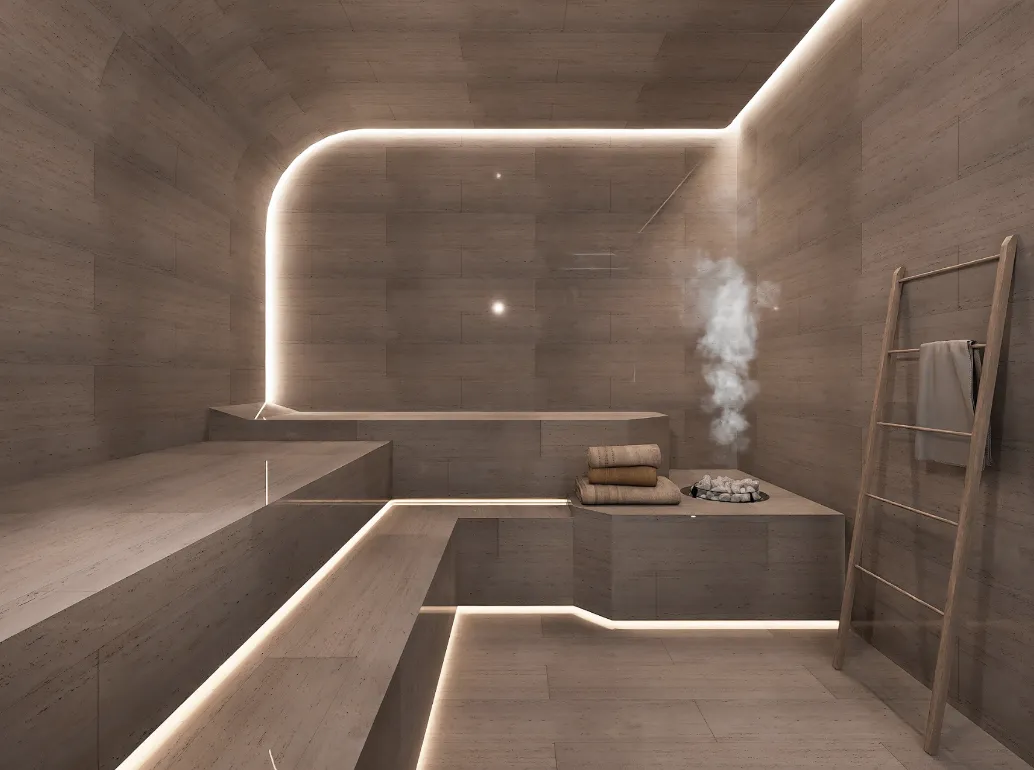 76 m² con sauna, vapor, 2 cabinas de masaje y regaderas terapéuticas.